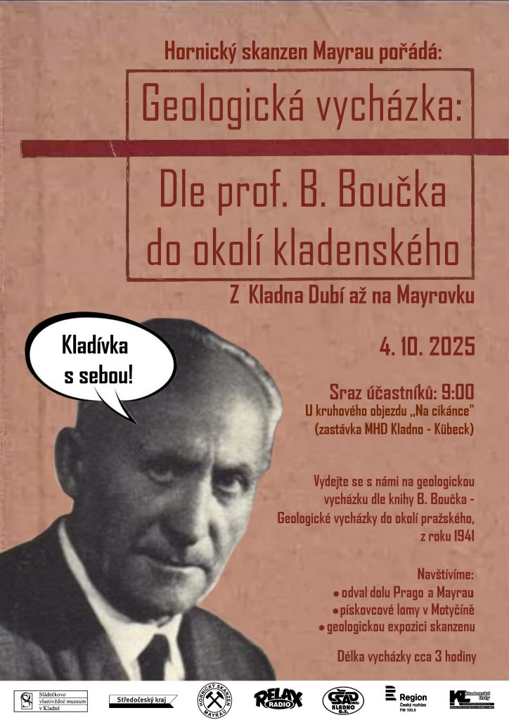 Geologická vycházka dle prof. B. Boučka do okolí kladenského. 4. října 2025 si projdeme odval dolu Prago, pískovny v Motyčíně, odval dolu Mayrau a exkurzi zakončíme v geologické expozici Hornického skanzenu Mayrau ve Vinařicích. Pomocníkem nám bude kniha Geologické vycházky do okolí pražského z roku 1941 od prof. B. Boučka. Sraz účastníků v 9:00 u kruhového objezdu ,,Na cikánce“ (zastávka MHD Kladno – Kübeck. Kladívka a noviny na zabalení vzorků s sebou!